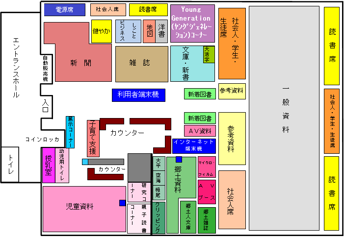 一般資料部門 郷土資料部門 新聞・雑誌 AV資料部門 児童資料部門 子育て支援
