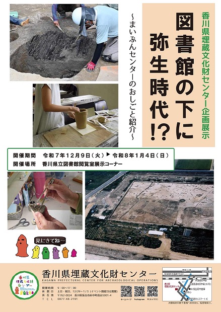 香川県埋蔵文化財センターが、県立図書館建設に際して発掘調査を行った空港跡地遺跡を題材に、センターの業務・役割(発掘調査から報告書作成とその後の普及事業まで)に関する展示を行い、県民に広く認知してもらうとともに、来年度以降のセンター利用・見学、イベント等へ参加していただくきっかけづくりとします。