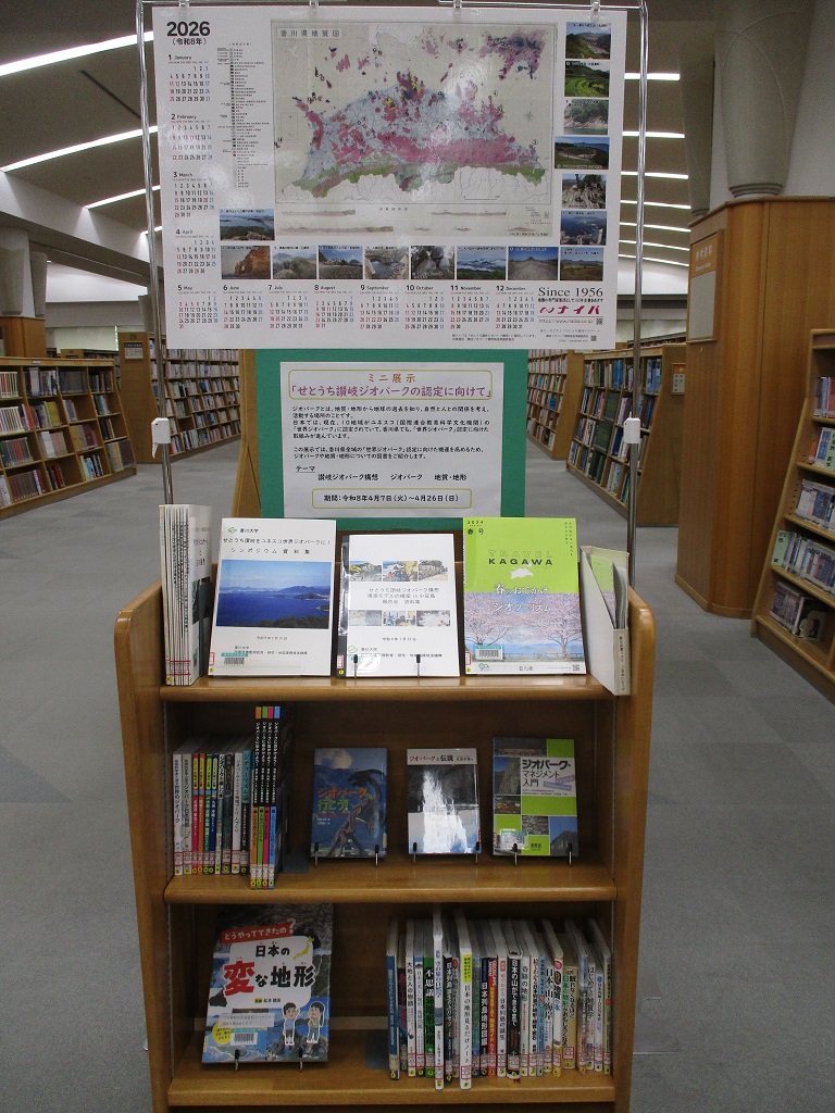 この展示では、香川県全域の「世界ジオパーク」認定に向けた機運を高めるため、ジオパークや地質・地形についての図書60冊をご紹介します。